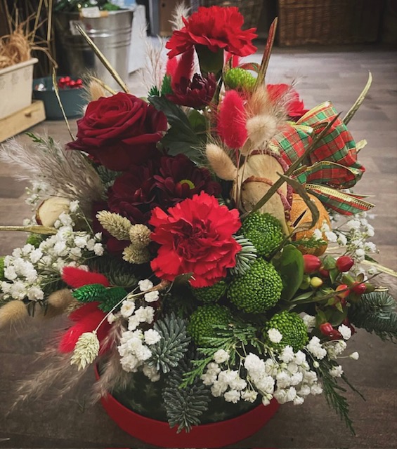 A frosty festive mix of white and green florals with the added touch of cones and your very own snow. All handtied bouquets come ready arranged in a bubble of water and gift box, with lovely festive packaging.