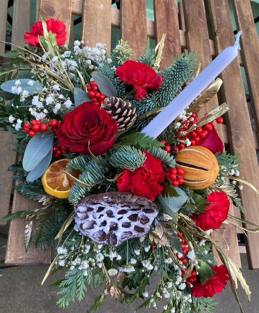 A warm festive arrangement created in floral foam. Perfect for those who would prefer something ready arranged for them and makes a great arrangement for the table centre.