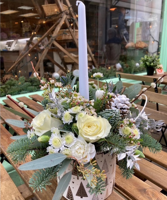 All round mixed arrangement created in floral foam within a ceramic festive pot. Perfect ready made gift to receive.