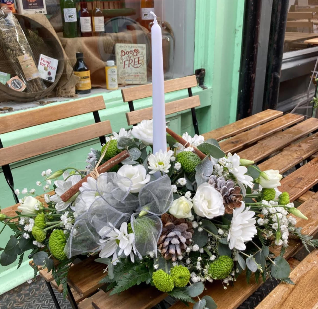 A frosty mixed arrangement created in floral foam. Perfect for those who would prefer something ready arranged for them and also makes a great arrangement for the table centre.
